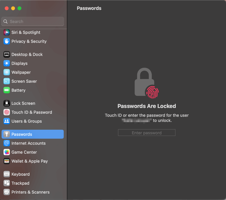 InSystemeinstellungen, navigieren Sie zuPasswörterauf der linken Seite.