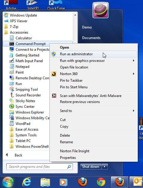 Schritt 2: Klicken Sie aufStartSchaltfläche, klickenAlle Programme, klicken Sie aufZubehörKlicken Sie dann mit der rechten Maustaste auf den OrdnerEingabeaufforderungOption und wählen SieAls Administrator ausführen.