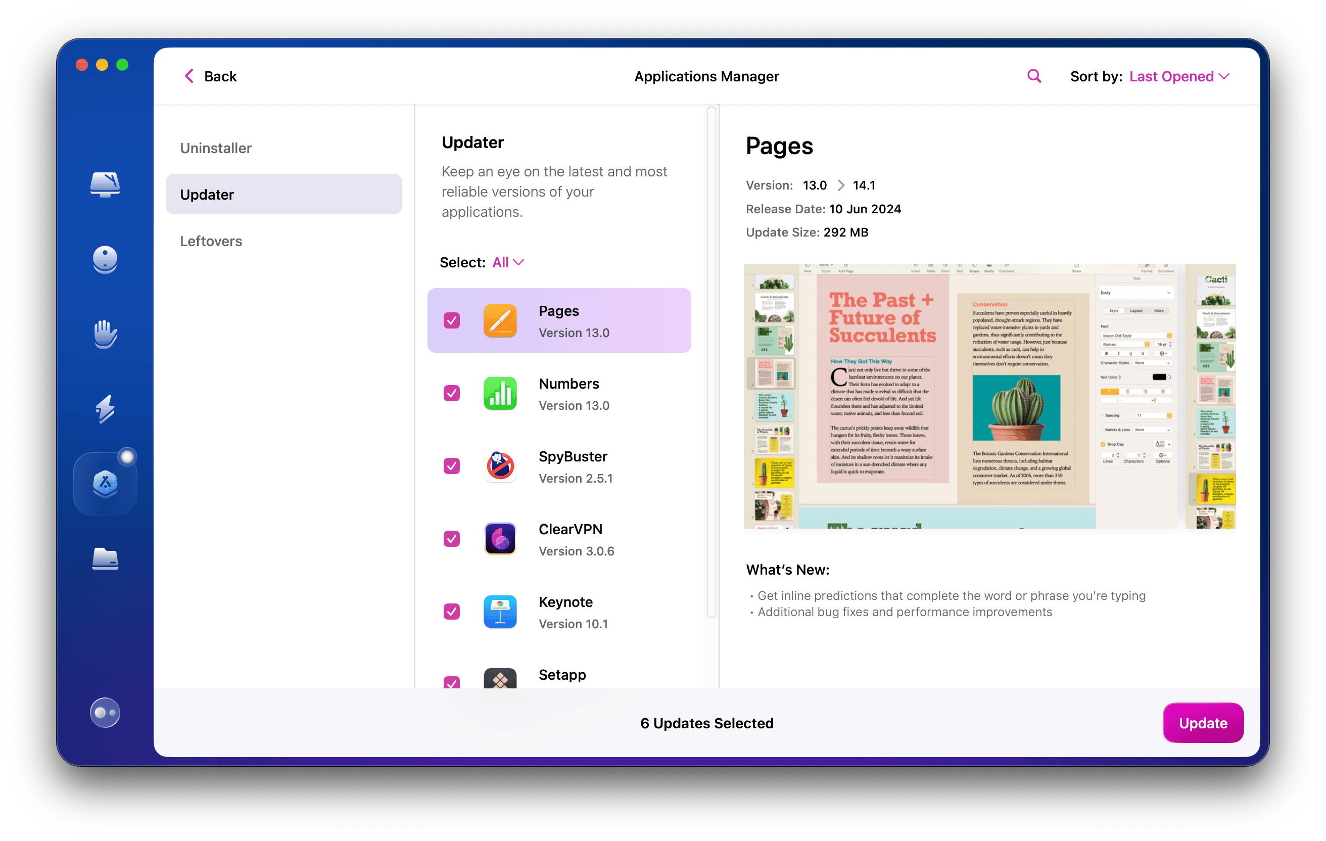 Ein großes Problem beim Betatest besteht für mich darin, sicherzustellen, dass alle meine Apps auf dem neuesten Stand sind. Ältere Versionen neigen dazu, in macOS-Builds vor der Veröffentlichung häufiger abzustürzen, was nicht ungewöhnlich ist, aber die Produktivität beeinträchtigen kann. Ich führe immer die Anwendungsfunktion ausCleanMyMac, das vor und während der Beta über ein praktisches Updater-Tool verfügt. Es überprüft jede installierte App (einschließlich der Apps, die nicht aus dem App Store stammen) und ermöglicht mir, sie alle auf einmal zu aktualisieren, was mir die manuelle Suche nach neuen Versionen erspart. So geht's: