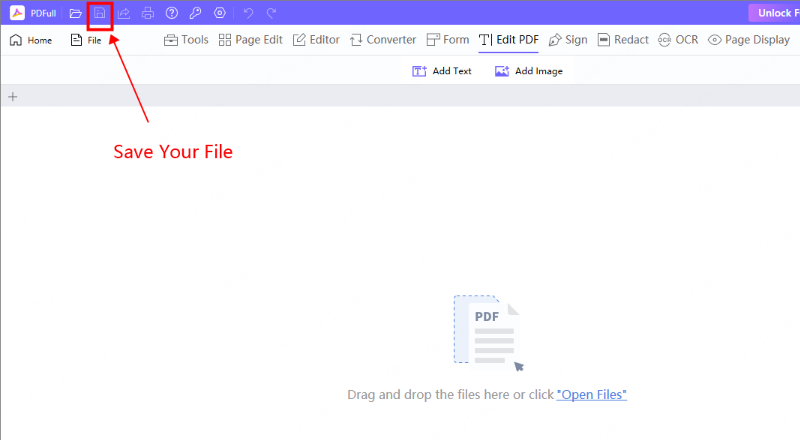 Starten Sie zunächst PDFull auf Ihrem Windows- oder macOS-Computer oder Laptop. Wählen "Dateien öffnen” und wählen Sie das PDF-Dokument aus, in dem Sie Textänderungen vornehmen möchten. Die grafische Benutzeroberfläche wurde entwickelt, um einen einfachen Zugriff auf die Dateien in kurzer Zeit zu ermöglichen.