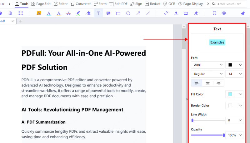 PDFull ist sich der Notwendigkeit einer Feinabstimmung des Textes bewusst und bietet eine Reihe von Bearbeitungsfunktionen. Bearbeiten Sie Text in PDF-Dokumenten, indem Sie mit wenigen Klicks die Textfarbe oder die Schriftgröße ändern.