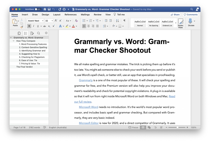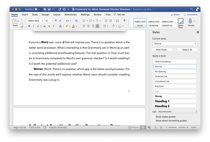 Die Benutzeroberfläche von Word verwendet eine Reihe von Menübändern, um die meisten Funktionen auszuführen. Die Anzahl der Tools übersteigt die in der Symbolleiste von Scrivener bei weitem, aber nicht alle sind beim Schreiben erforderlich. Wie Scrivener können Sie Ihren Text mit Stilen wie „Normal“, „Geordnete Liste“ und „Überschrift 1“ formatieren.