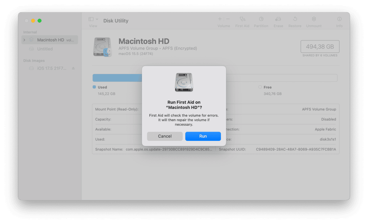 - Führen Sie First Aid sowohl auf dem System als auch auf den Datenvolumes aus, sofern vorhanden.