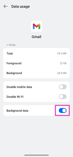 Gehe zuEinstellungen > Apps > Gmail > Datennutzungund schalten Sie den Kippschalter neben „Hintergrunddaten“ ein.