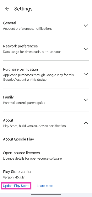 Starten Sie den Play Store, tippen Sie auf Ihr Profilbild und gehen Sie zuEinstellungen > Infound tippen Sie auf „Play Store aktualisieren“.