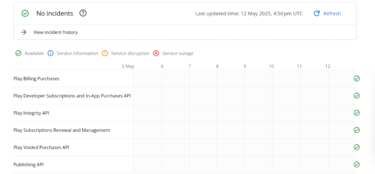 Möglicherweise liegt das Problem nicht bei Ihrem Gerät, sondern bei den Servern des Play Store. Serverausfälle sind keine Seltenheit. Um zu bestätigen, ob im Play Store derzeit ein Serverproblem auftritt, gehen Sie zuhttps://status.play.google.com/und suchen Sie nach roten Kreuzen entlang der verschiedenen Parameter. Alternativ können Sie für diesen Job auch Drittanbieterdienste wie „DownDetector“ und „Is It Down by Freshping“ nutzen.