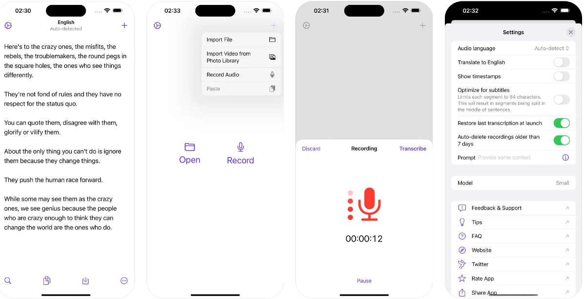 Basierend auf Whisper von Open AI,Sendenist eine der besten Apps zum Transkribieren von Sprachnotizen auf Ihrem iPhone und Mac. Das Beste daran ist, dass die App die gesamte Rechenleistung auf Ihrem Gerät übernimmt. Die Genauigkeit von Aiko beim Transkribieren der Sprachnotizen wird von keiner anderen App erreicht. Es eliminiert die Geräusche, die dem Memo nichts hinzufügen, und präsentiert eine saubere, klare Transkription. Sie können diese App für Sprachnotizen verwenden, die mehrere Stunden lang sind. Die einzige Voraussetzung ist, dass auf Ihrem iPhone iOS 17.2 oder höher läuft und es mit einem A12 Bionic-Chip oder höher ausgestattet sein sollte.