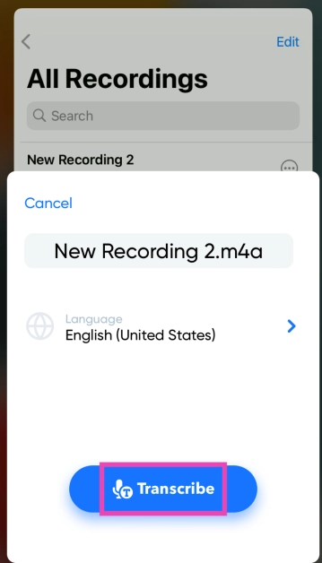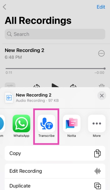 Schritt 4:Wählen Sie aus der App-Liste ausTranskribieren.