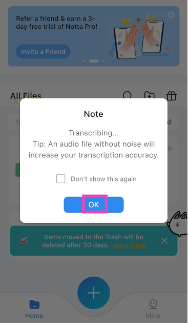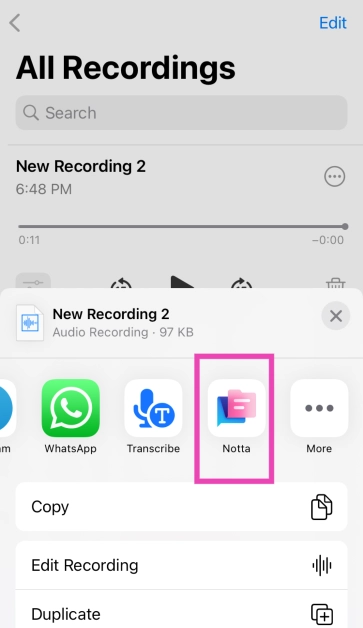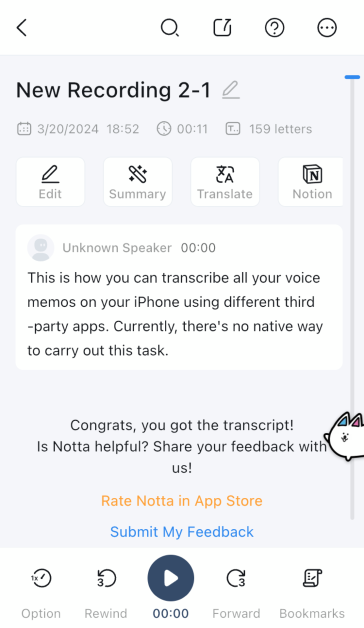 Schritt 6:Sobald die Sprachnotiz erstellt wurdetranskribiertEs wird als Textdatei in der Notta-App angezeigt.