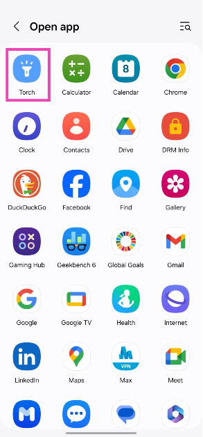 Schritt 4:Klicken Sie auf das Einstellungssymbol danebenApp öffnenund auswählenFackel.