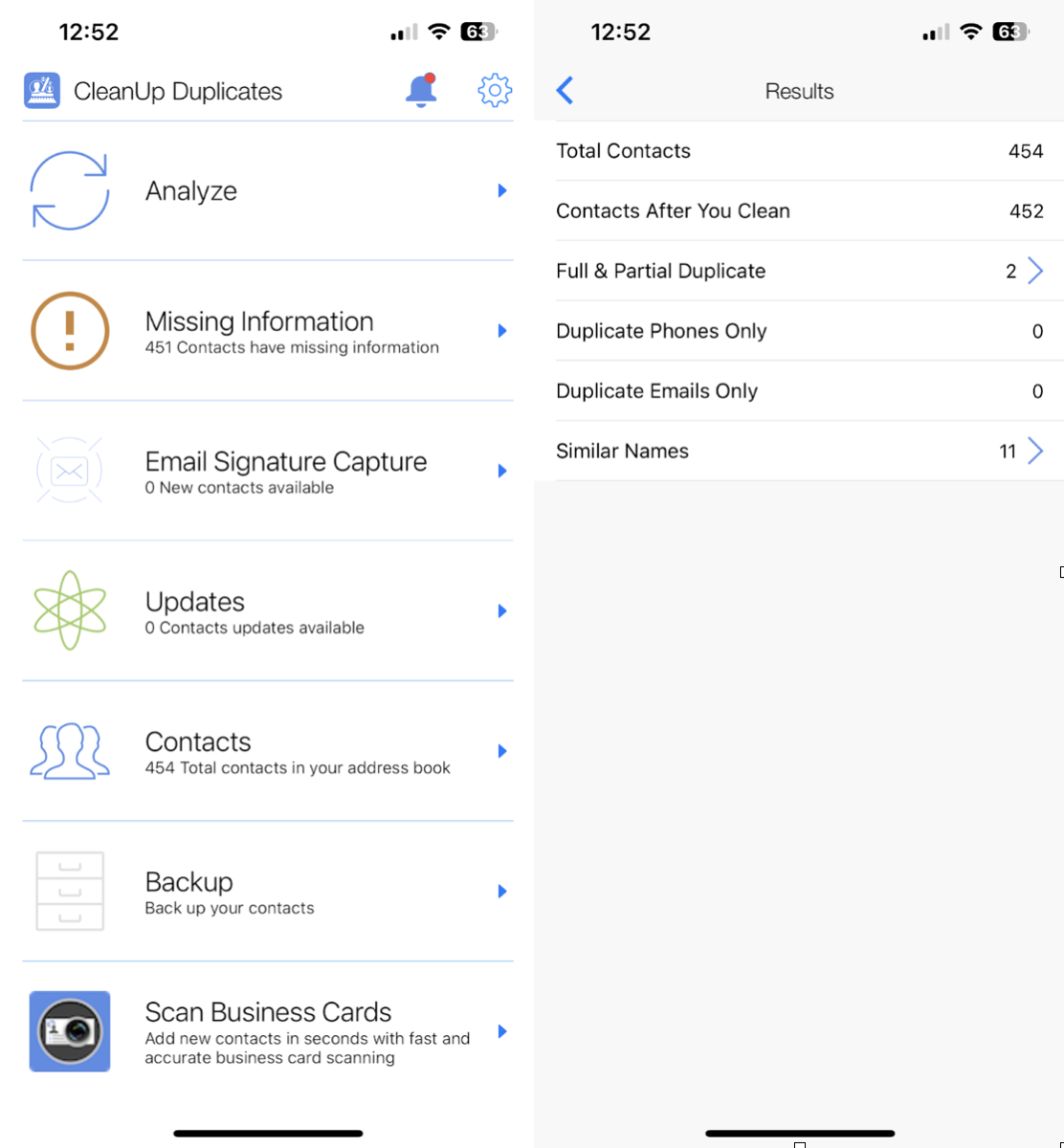 Eine unkomplizierteKontaktreinigermit großen, gut lesbaren Tasten. In meinen Tests wurden genaue Duplikate schnell erkannt und der Zusammenführungsvorgang für technisch nicht versierte Benutzer vereinfacht. Eine Sache ist, dass Beinahe-Duplikate mit leicht unterschiedlichen Namen möglicherweise einen zweiten Durchgang oder eine manuelle Verknüpfung erfordern. Die integrierte Backup-Option ist vorhanden, liegt jedoch hinter der kostenpflichtigen Stufe zurück.