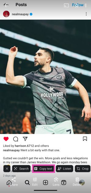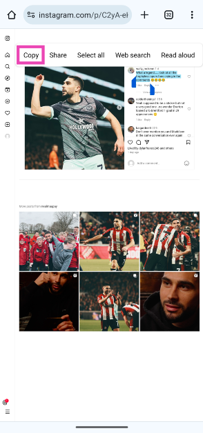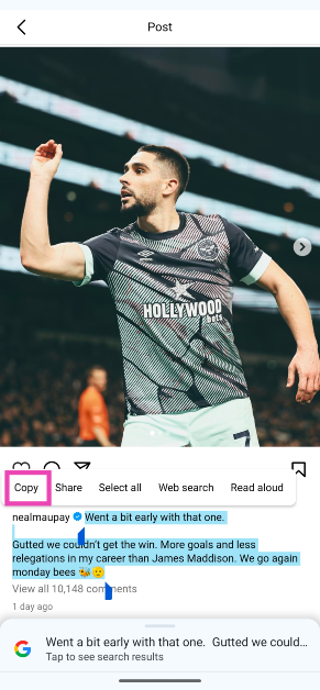 Seltsamerweise funktioniert diese Methode nur für Instagram-Untertitel. Wenn Sie einen Kommentar kopieren möchten, befolgen Sie die unten beschriebene Methode.