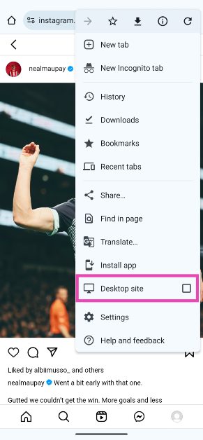 Kopieren Sie Instagram-Kommentare im Desktop-Modus in Chrome (Android und iOS).