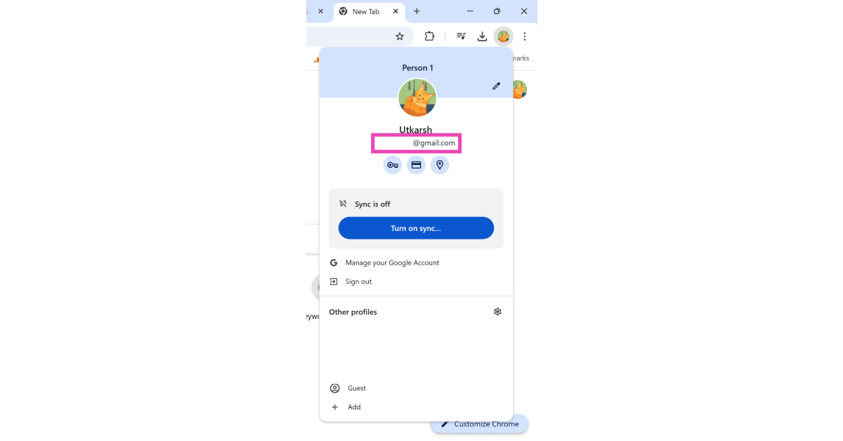 Wenn Sie mit Ihrem Google-Konto bei Chrome angemeldet sind, ist der Zugriff auf Ihre E-Mails nur einen Klick entfernt. Starten Sie Google Chrome und klicken Sie neben der Adressleiste auf Ihr Profilbild. Ihre E-Mail-Adresse wird direkt unter Ihrem Namen aufgeführt. Sie können auch zu den Chrome-Einstellungen gehen und Ihre E-Mail-Adresse auf der Registerkarte „Sie und Google“ finden.