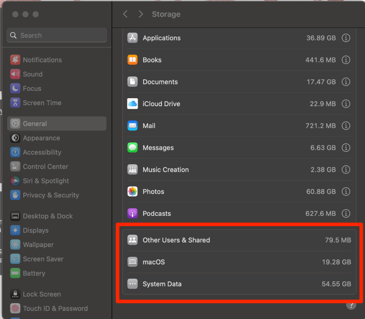 Diese Elemente unten auf Ihrer Speicherseite sind nützlich, um die Nutzung Ihres Systemspeichers im Auge zu behalten. Wie Sie sehen können,macOS Sonoma benötigt 19,29 GBmeines Speichers, was für Systeme mit weniger Speicher von Bedeutung sein kann!