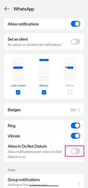 Erlauben Sie WhatsApp, Benachrichtigungen zu senden, wenn der DND-Modus aktiviert ist