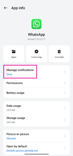 Gehe zuEinstellungen > Apps > WhatsApp > Benachrichtigungen verwaltenund schalten Sie den Kippschalter neben „Benachrichtigungen zulassen“ ein.
